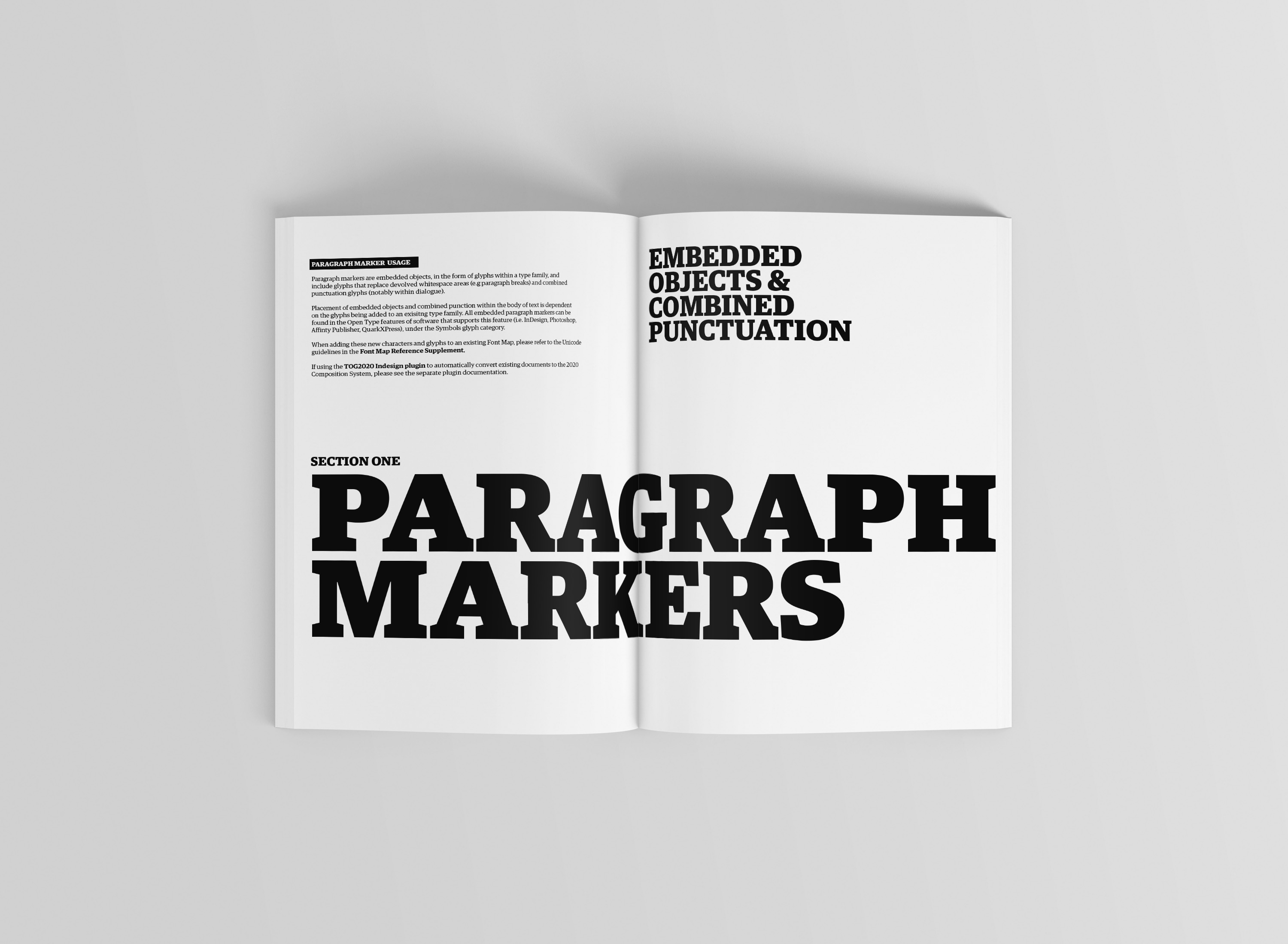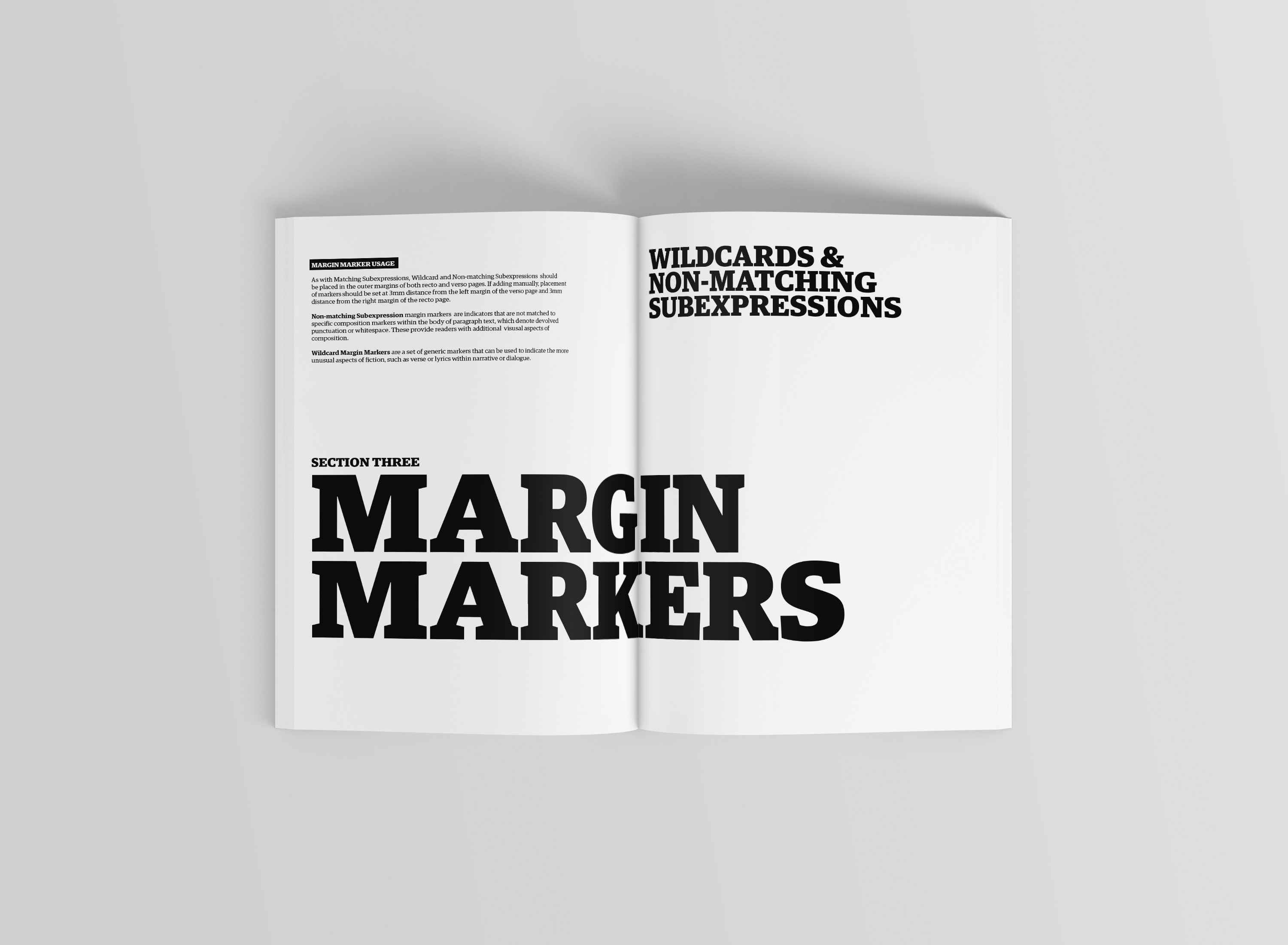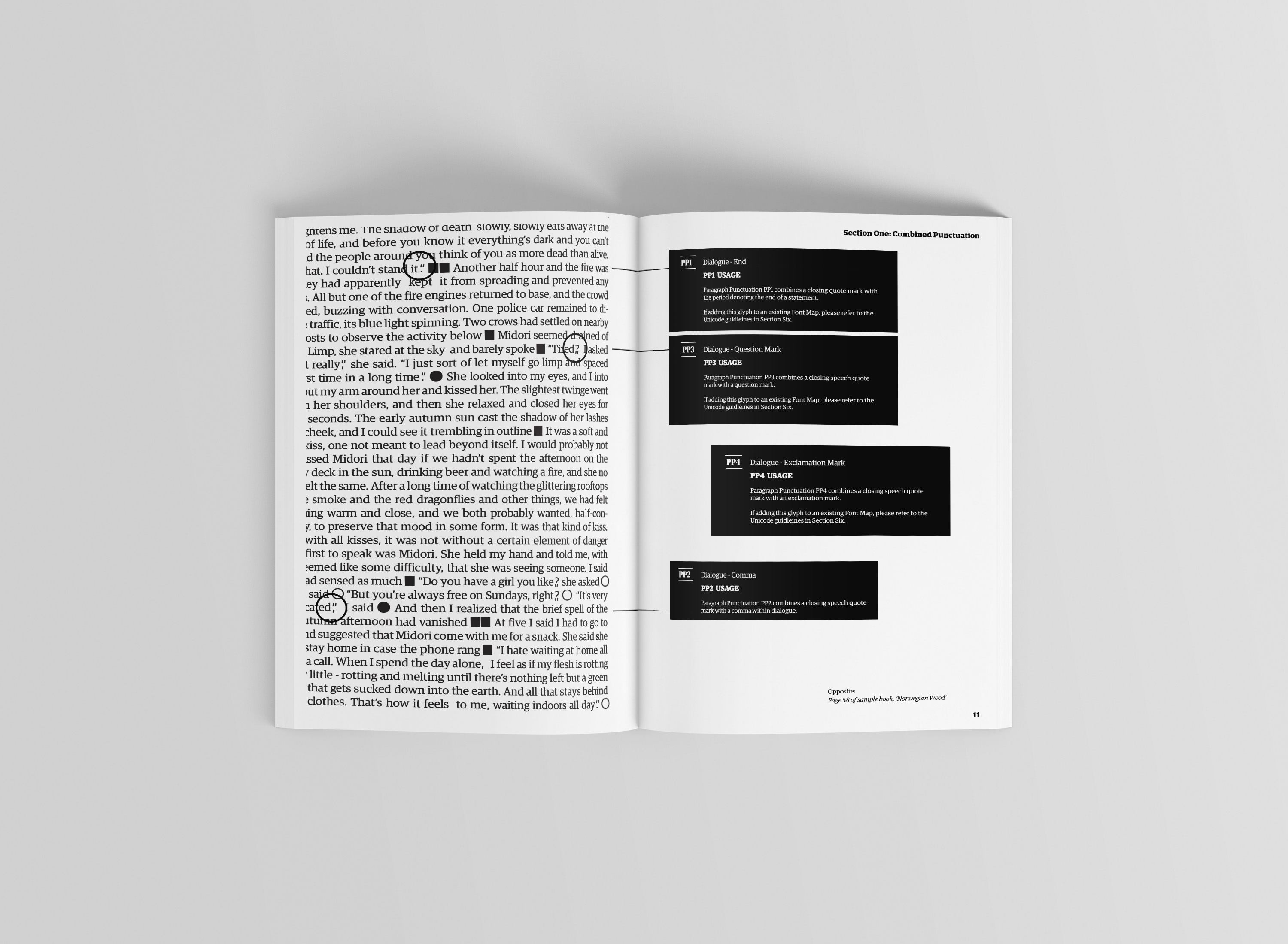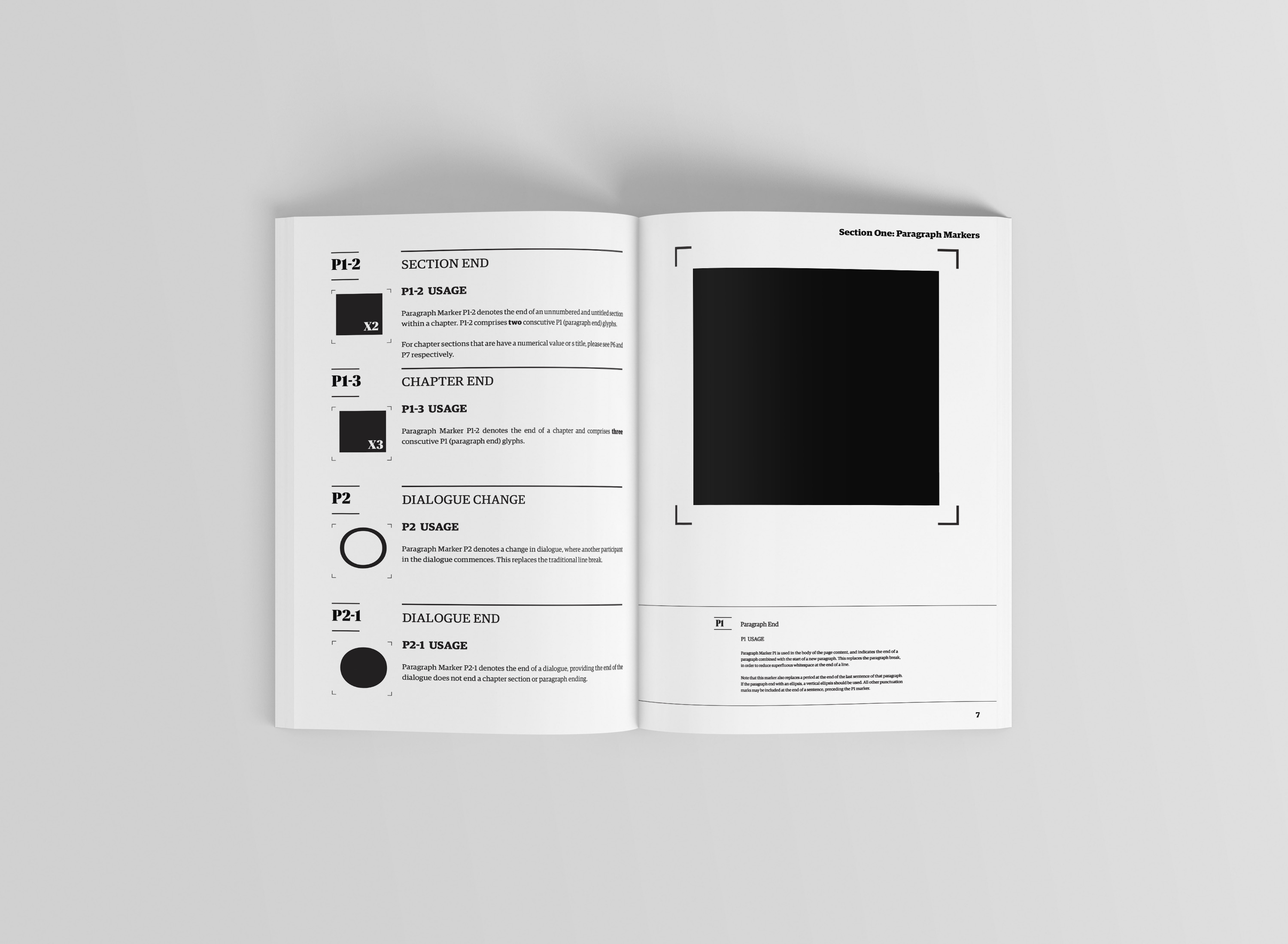 A typographical composition solution to 1) reduce the amount of whitespace in mass publishing, whilst retaining legibility and aesthetics, 2) create a set of composition rules that take into account contemporary environmental issues. The typographic solution comprises of a set of glyphs which replace traditional line and paragraph breaks, as well as introducing new composition formatting. Additionally, there is a set of 8 new combined punctuation marks for dialogue within the body of text.