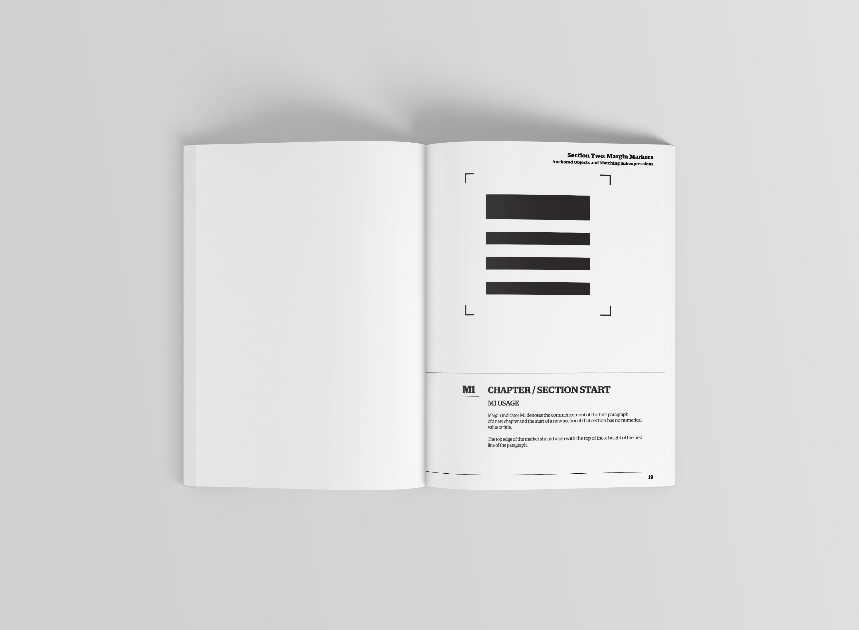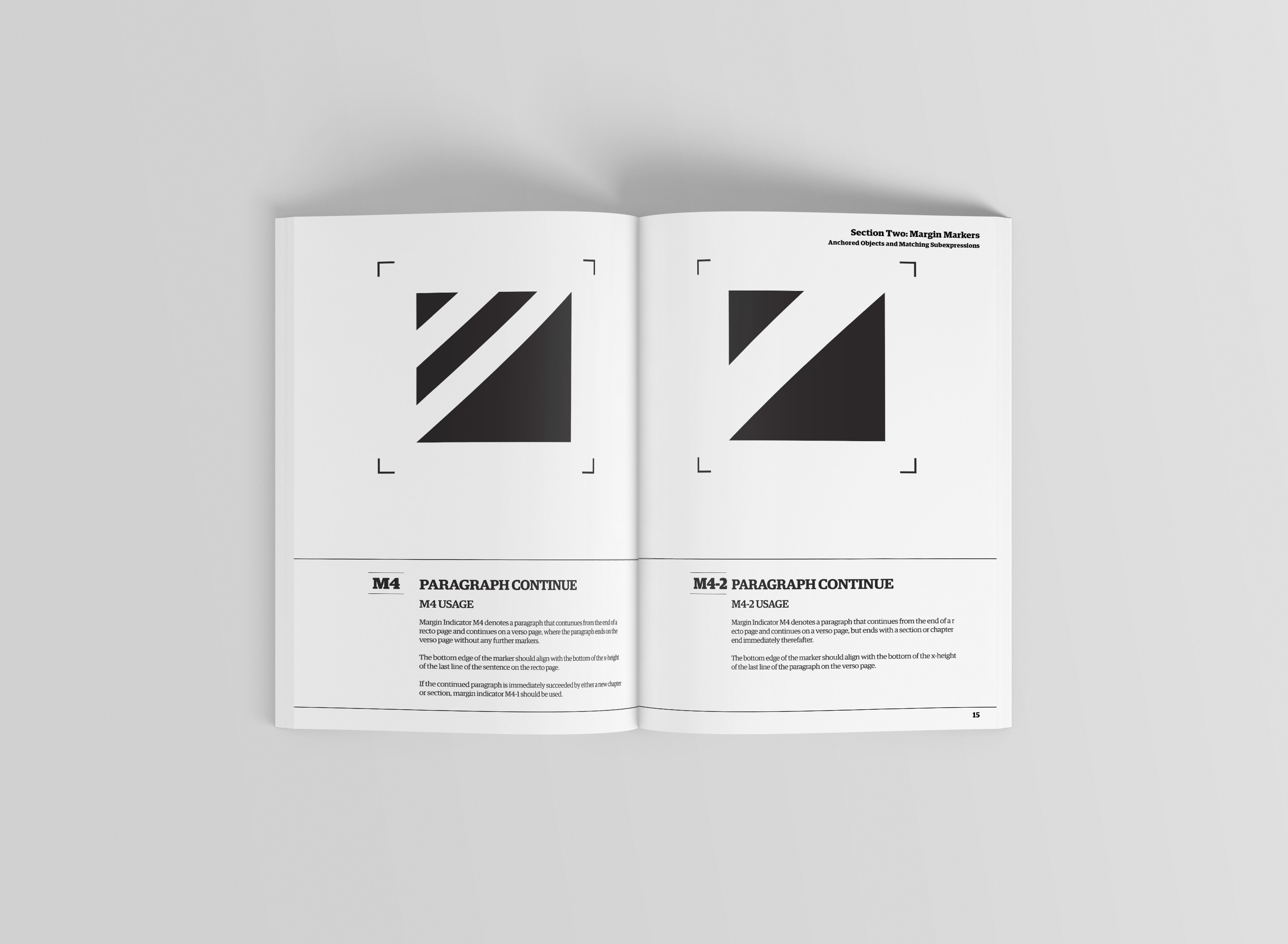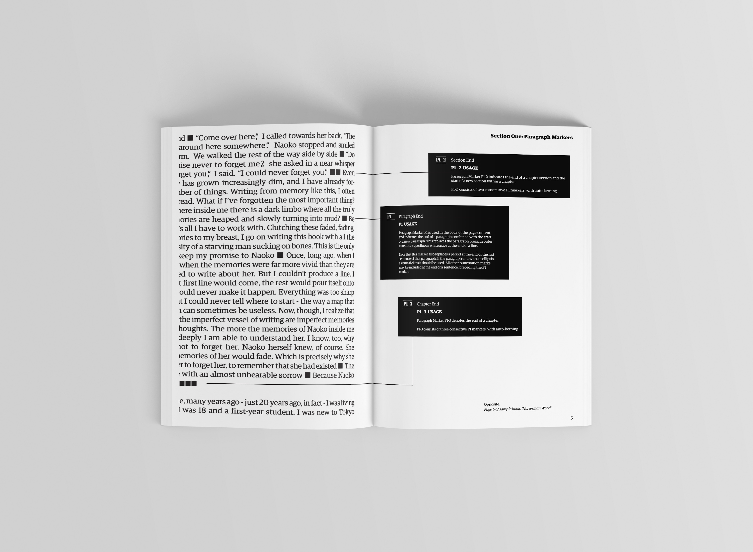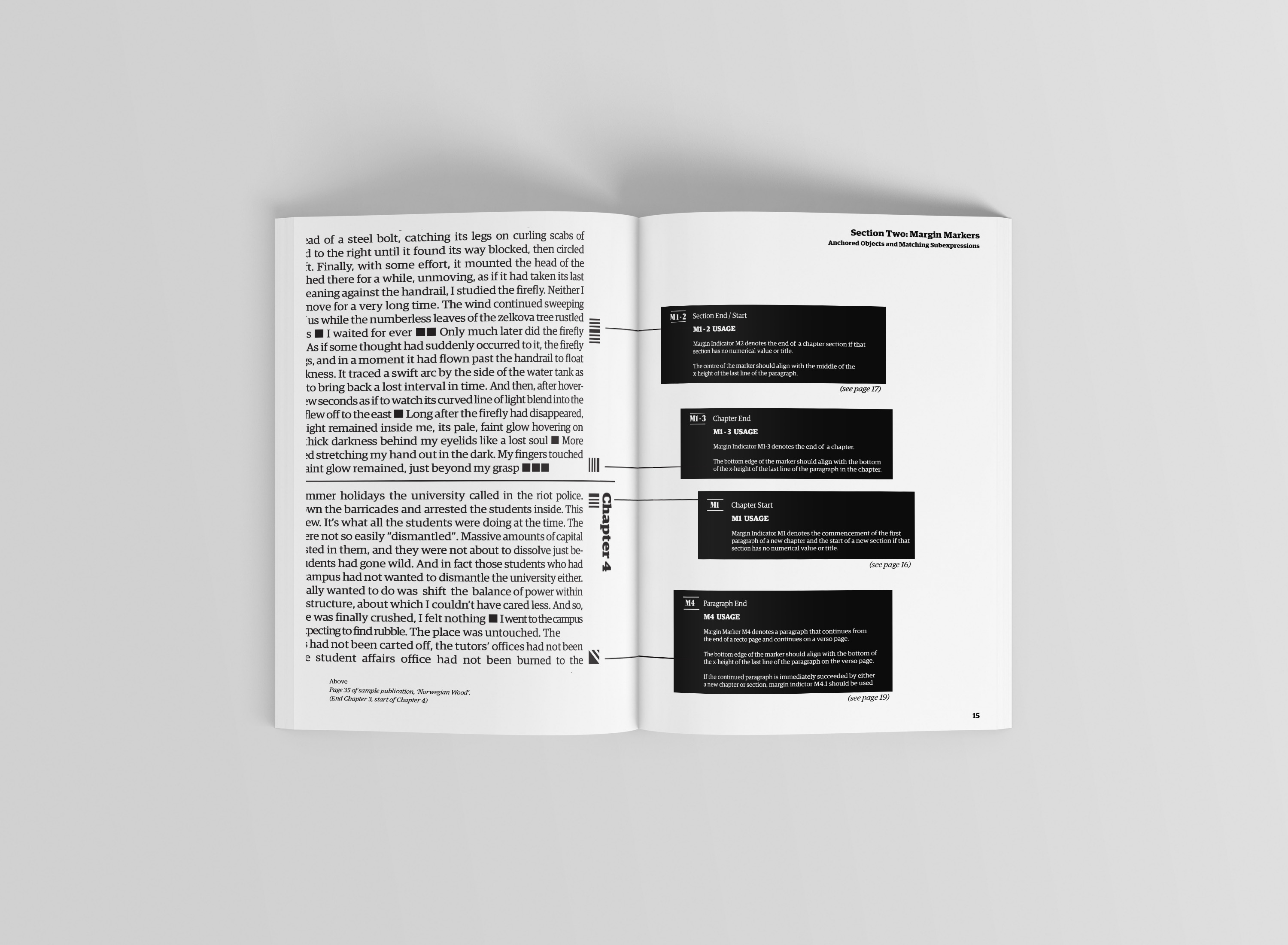 A typographical composition solution to 1) reduce the amount of whitespace in mass publishing, whilst retaining legibility and aesthetics, 2) create a set of composition rules that take into account contemporary environmental issues. The typographic solution comprises of a set of glyphs which replace traditional line and paragraph breaks, as well as introducing new composition formatting. Additionally, there is a set of 8 new combined punctuation marks for dialogue within the body of text.